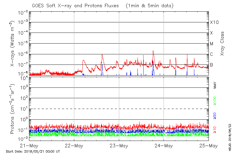 This page provides light-curves generated from GOES soft X-ray and Particle data for the date indicated at the top and the preceding three days.