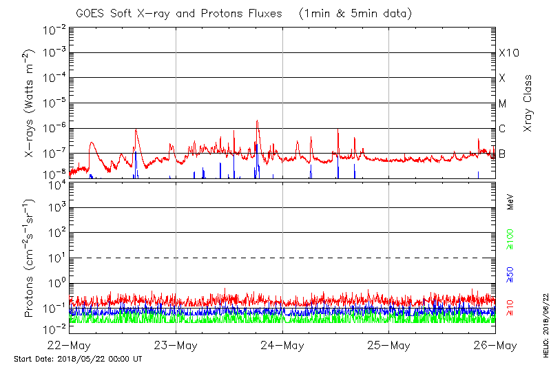 This page provides light-curves generated from GOES soft X-ray and Particle data for the date indicated at the top and the preceding three days.