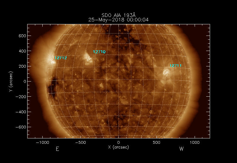 Click on an Active Region plot to display the Region Report including the region evolution and flaring history. HEC Search for NOAA Active Regions (SRS) records for this date and the day before.