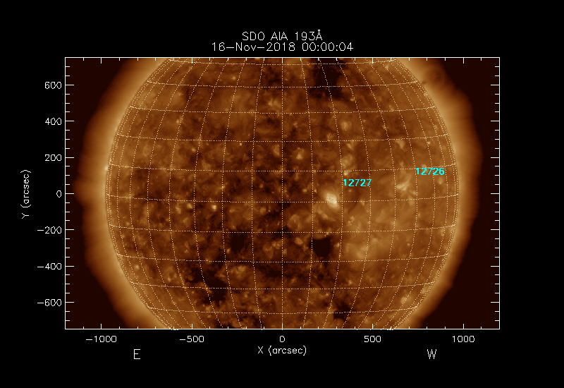 Click on an Active Region plot to display the Region Report including the region evolution and flaring history. HEC Search for NOAA Active Regions (SRS) records for this date and the day before.