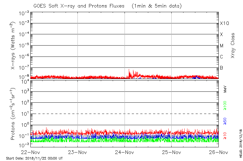 This page provides light-curves generated from GOES soft X-ray and Particle data for the date indicated at the top and the preceding three days.
