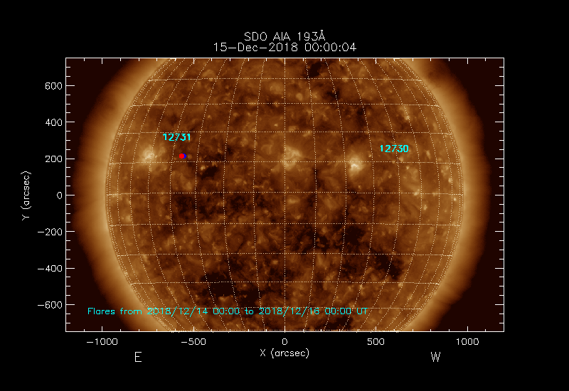 Click on an Active Region plot to display the Region Report including the region evolution and flaring history. HEC Search for NOAA Active Regions (SRS) records for this date and the day before.