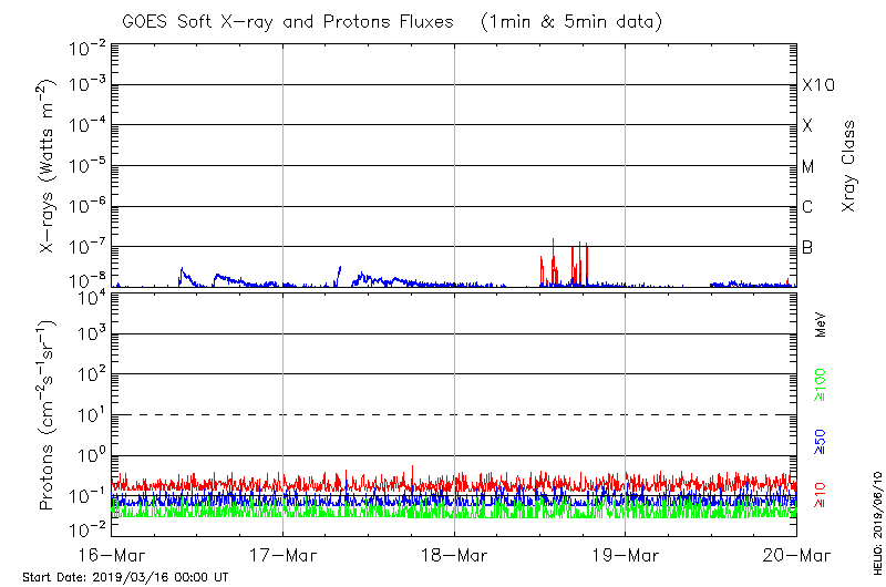This page provides light-curves generated from GOES soft X-ray and Particle data for the date indicated at the top and the preceding three days.