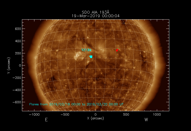 The most recent flares (≤12 hours) are shown as red dots, 12-24 hours ago as blue dots and older ones as turquoise dots.