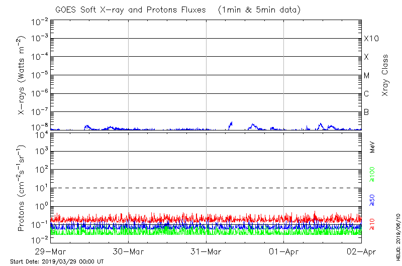 This page provides light-curves generated from GOES soft X-ray and Particle data for the date indicated at the top and the preceding three days.