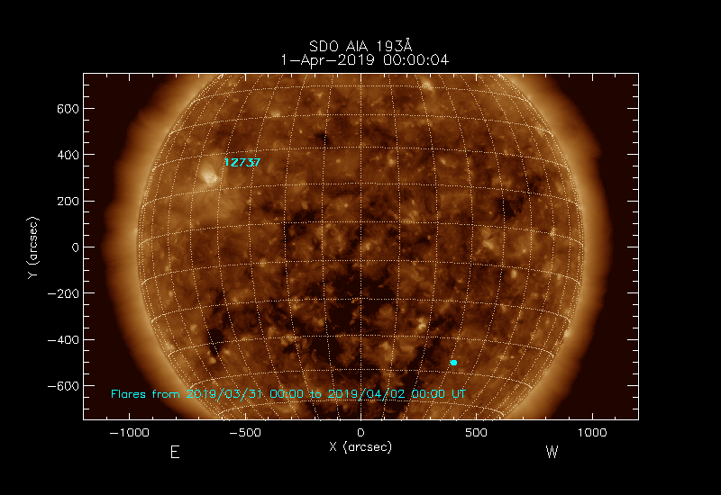 Click on an Active Region plot to display the Region Report including the region evolution and flaring history. HEC Search for NOAA Active Regions (SRS) records for this date and the day before.