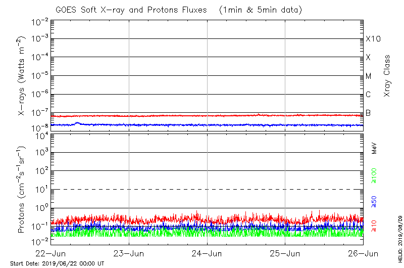 This page provides light-curves generated from GOES soft X-ray and Particle data for the date indicated at the top and the preceding three days.