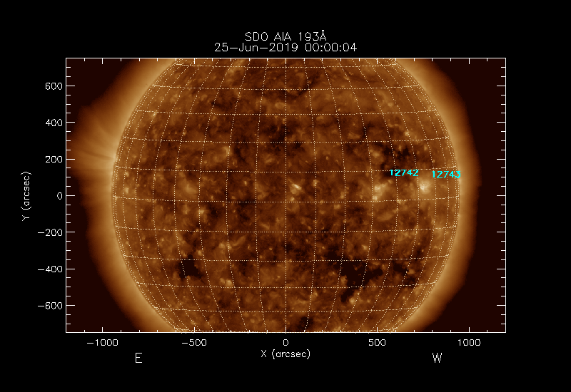Click on an Active Region plot to display the Region Report including the region evolution and flaring history. HEC Search for NOAA Active Regions (SRS) records for this date and the day before.