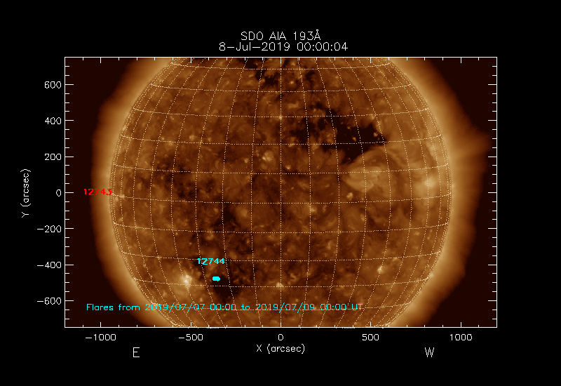 Click on an Active Region plot to display the Region Report including the region evolution and flaring history. HEC Search for NOAA Active Regions (SRS) records for this date and the day before.