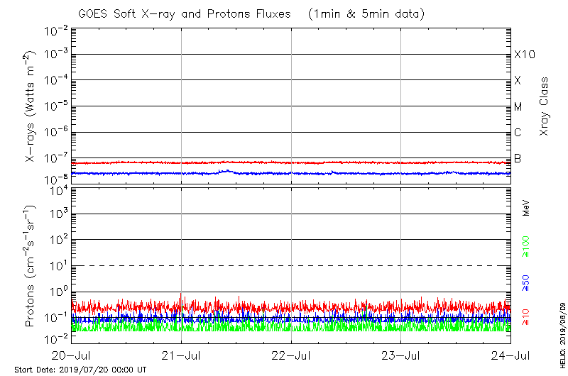 This page provides light-curves generated from GOES soft X-ray and Particle data for the date indicated at the top and the preceding three days.