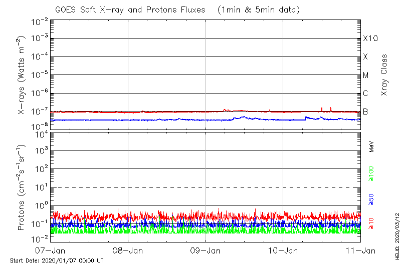 This page provides light-curves generated from GOES soft X-ray and Particle data for the date indicated at the top and the preceding three days.