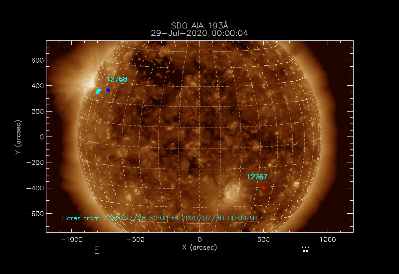 Click on an Active Region plot to display the Region Report including the region evolution and flaring history. HEC Search for NOAA Active Regions (SRS) records for this date and the day before.