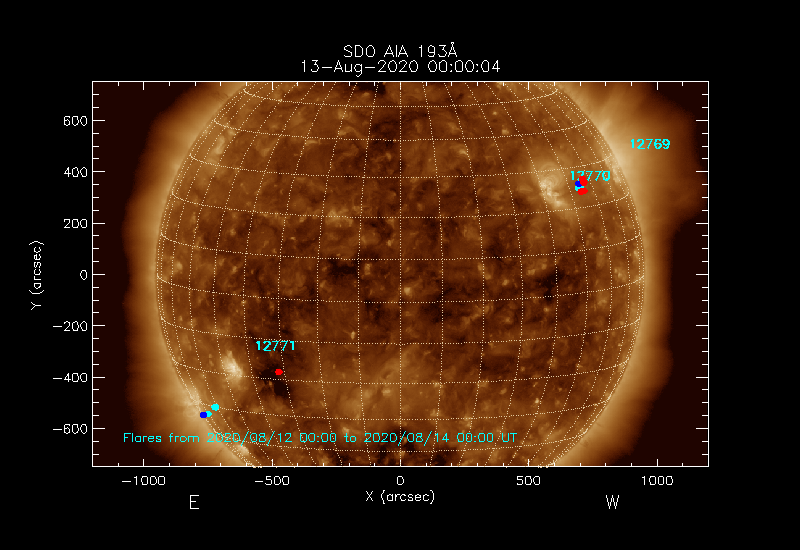 The most recent flares (≤12 hours) are shown as red dots, 12-24 hours ago as blue dots and older ones as turquoise dots.