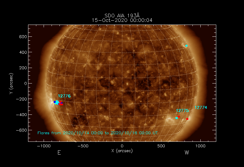 The most recent flares (≤12 hours) are shown as red dots, 12-24 hours ago as blue dots and older ones as turquoise dots.