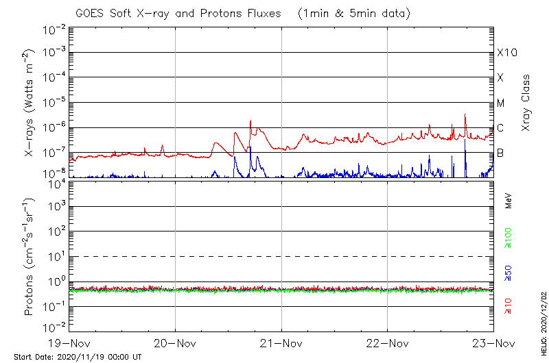 This page provides light-curves generated from GOES soft X-ray and Particle data for the date indicated at the top and the preceding three days.
