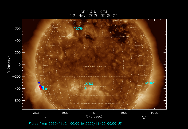 The most recent flares (≤12 hours) are shown as red dots, 12-24 hours ago as blue dots and older ones as turquoise dots.