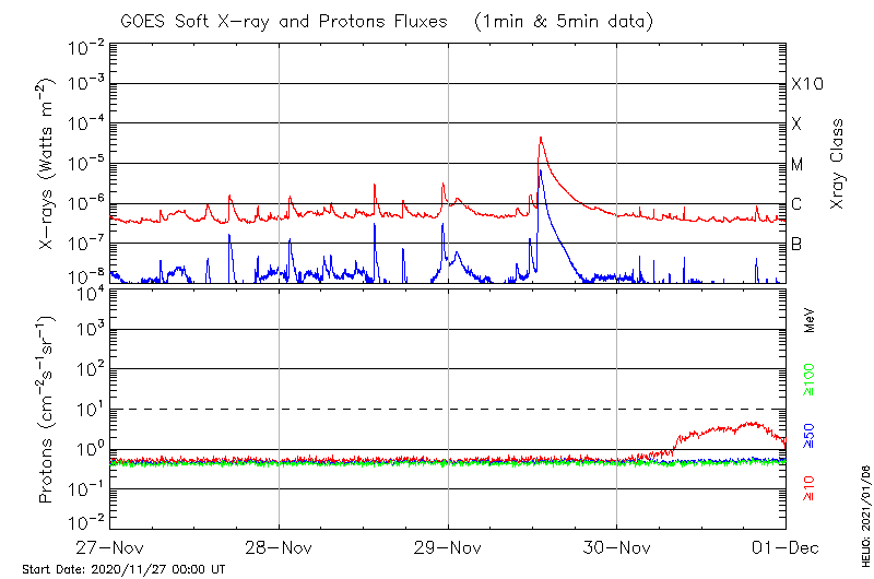 This page provides light-curves generated from GOES soft X-ray and Particle data for the date indicated at the top and the preceding three days.
