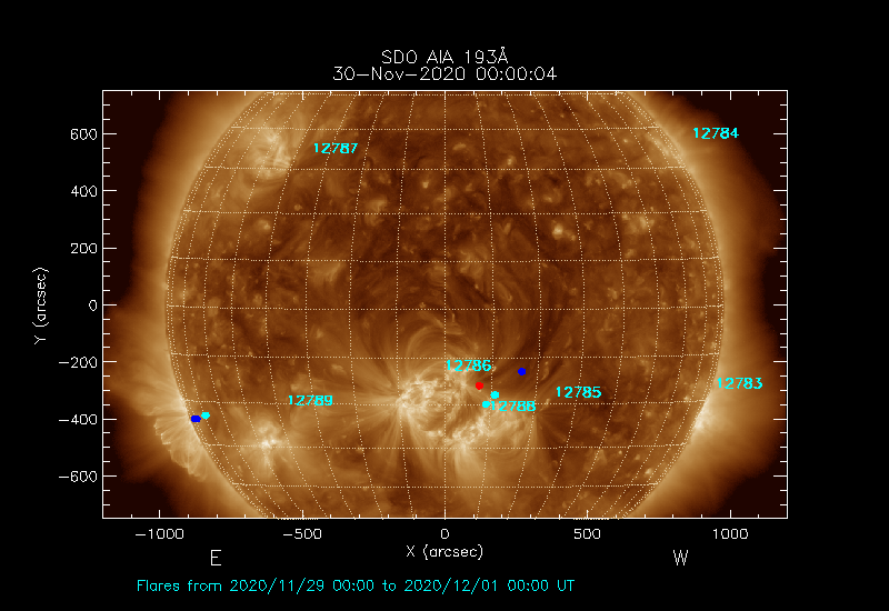 The most recent flares (≤12 hours) are shown as red dots, 12-24 hours ago as blue dots and older ones as turquoise dots.