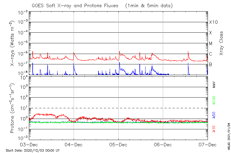 This page provides light-curves generated from GOES soft X-ray and Particle data for the date indicated at the top and the preceding three days.
