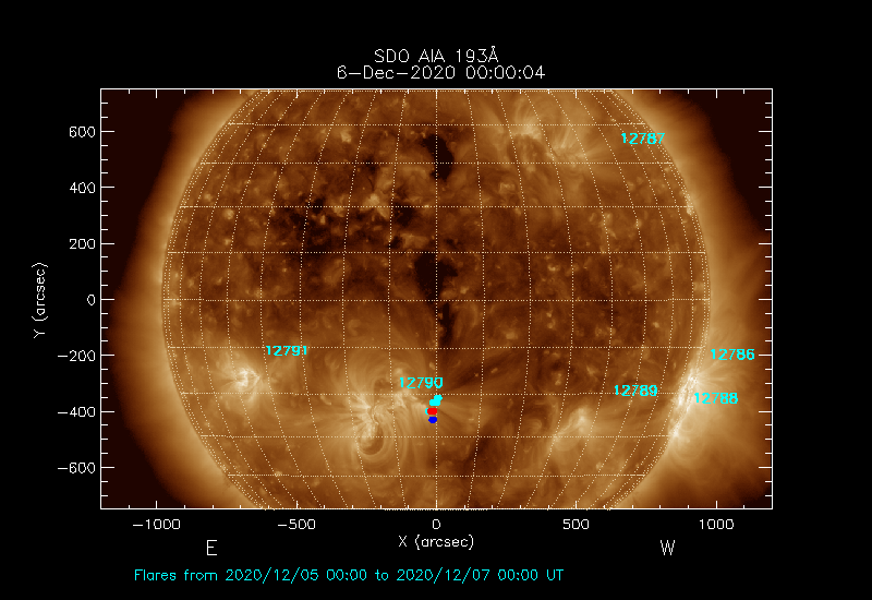 The most recent flares (≤12 hours) are shown as red dots, 12-24 hours ago as blue dots and older ones as turquoise dots.