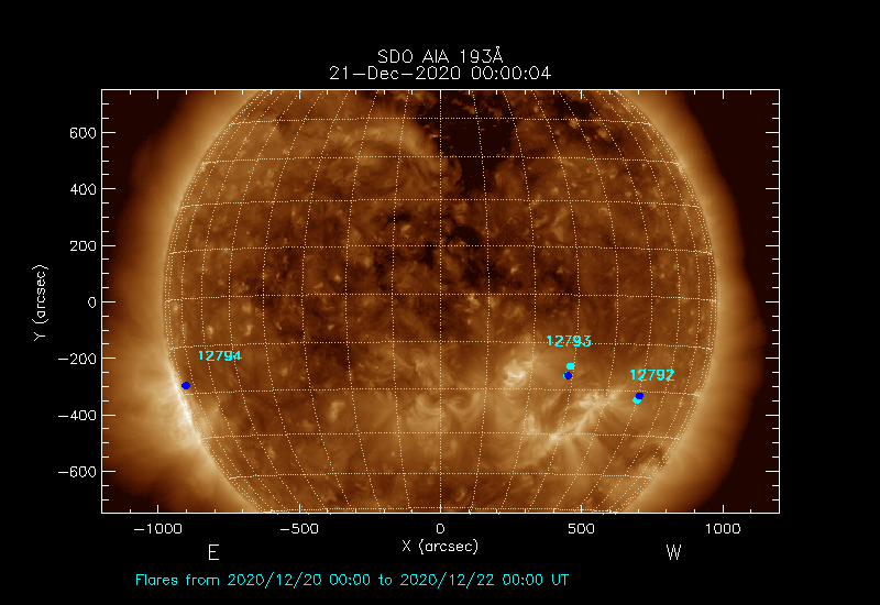The most recent flares (≤12 hours) are shown as red dots, 12-24 hours ago as blue dots and older ones as turquoise dots.