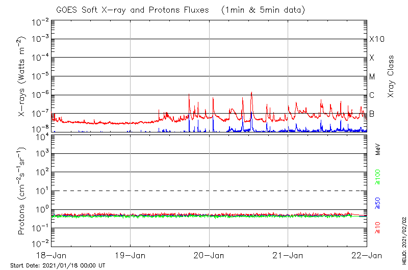 This page provides light-curves generated from GOES soft X-ray and Particle data for the date indicated at the top and the preceding three days.