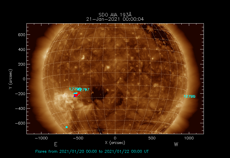 Click on an Active Region plot to display the Region Report including the region evolution and flaring history. HEC Search for NOAA Active Regions (SRS) records for this date and the day before.