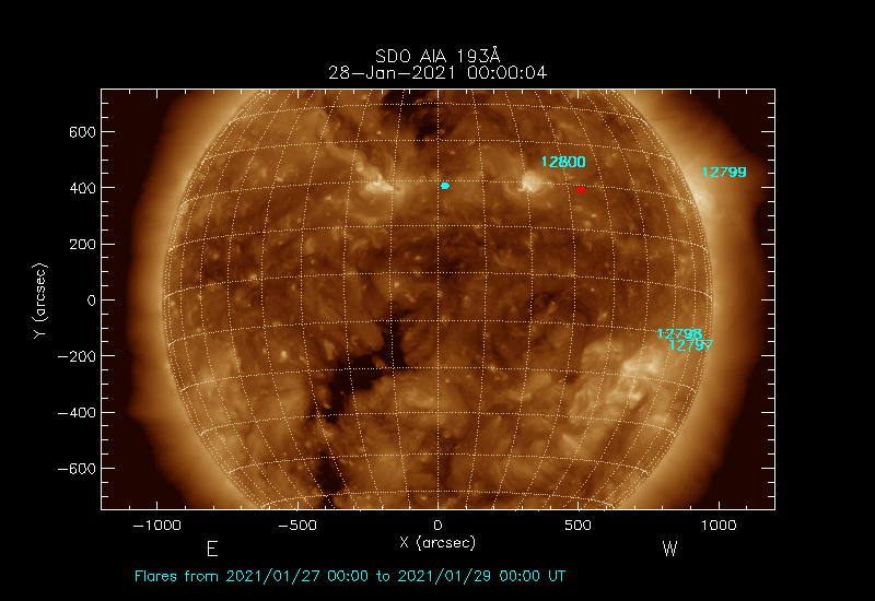 The most recent flares (≤12 hours) are shown as red dots, 12-24 hours ago as blue dots and older ones as turquoise dots.