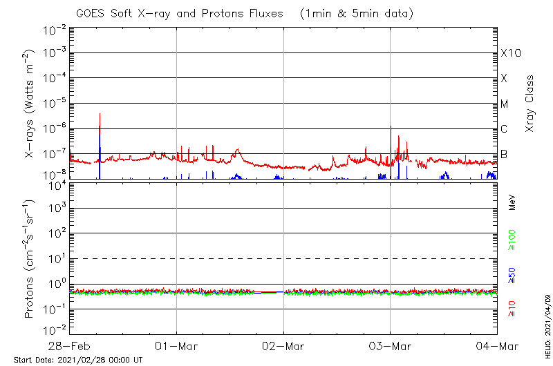 This page provides light-curves generated from GOES soft X-ray and Particle data for the date indicated at the top and the preceding three days.
