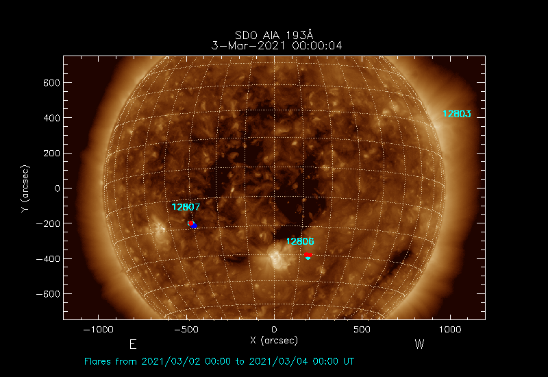 The most recent flares (≤12 hours) are shown as red dots, 12-24 hours ago as blue dots and older ones as turquoise dots.