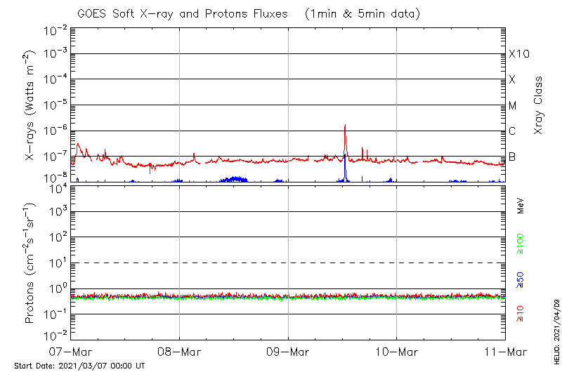 This page provides light-curves generated from GOES soft X-ray and Particle data for the date indicated at the top and the preceding three days.