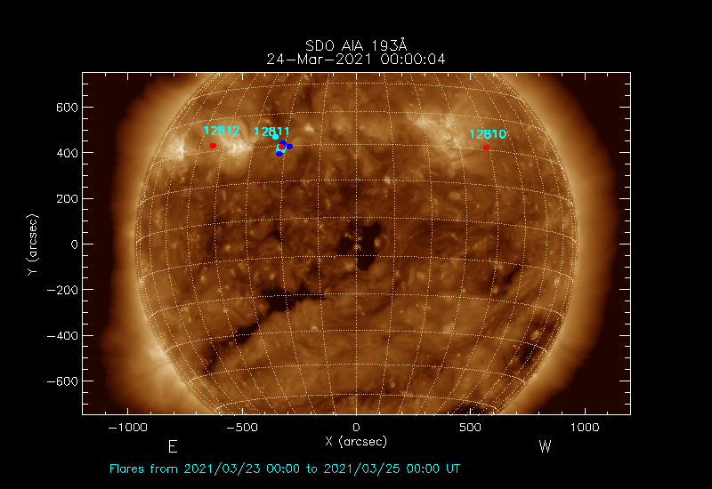 The most recent flares (≤12 hours) are shown as red dots, 12-24 hours as blue