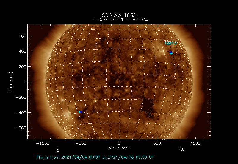 Flares for the 48 hours leading up to the time are over-plotted; these are rotated to the time of the FITS image.