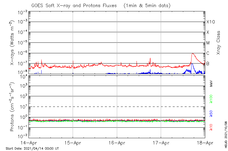 This page provides light-curves generated from GOES soft X-ray and Particle data for the date indicated at the top and the preceding three days.