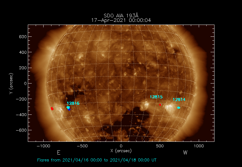 Click on an Active Region plot to display the Region Report including the region evolution and flaring history. HEC Search for NOAA Active Regions (SRS) records for this date and the day before.