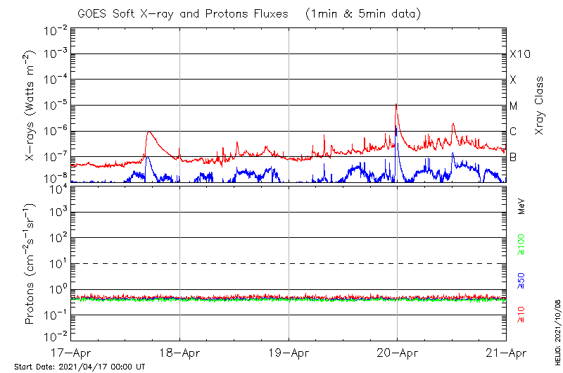 This page provides light-curves generated from GOES soft X-ray and Particle data for the date indicated at the top and the preceding three days.