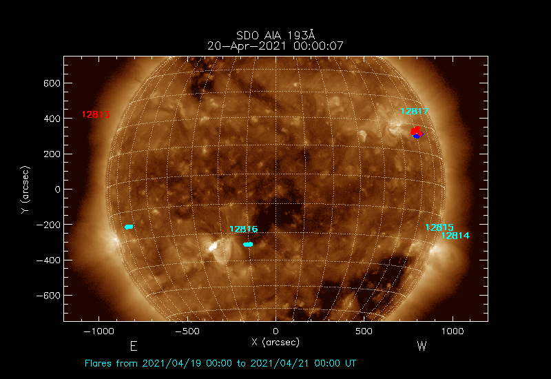The most recent flares (≤12 hours) are shown as red dots, 12-24 hours ago as blue dots and older ones as turquoise dots.