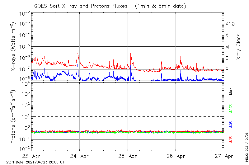 This page provides light-curves generated from GOES soft X-ray and Particle data for the date indicated at the top and the preceding three days.