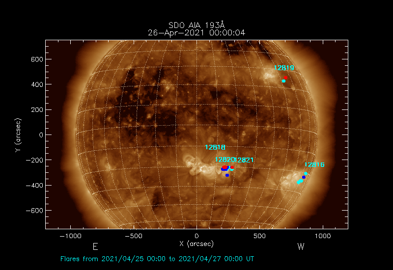 The most recent flares (≤12 hours) are shown as red dots, 12-24 hours ago as blue dots and older ones as turquoise dots.