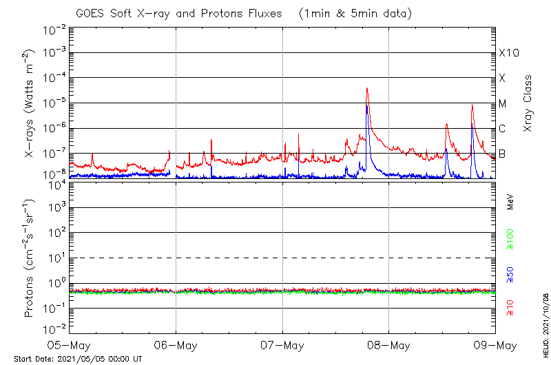 This page provides light-curves generated from GOES soft X-ray and Particle data for the date indicated at the top and the preceding three days.