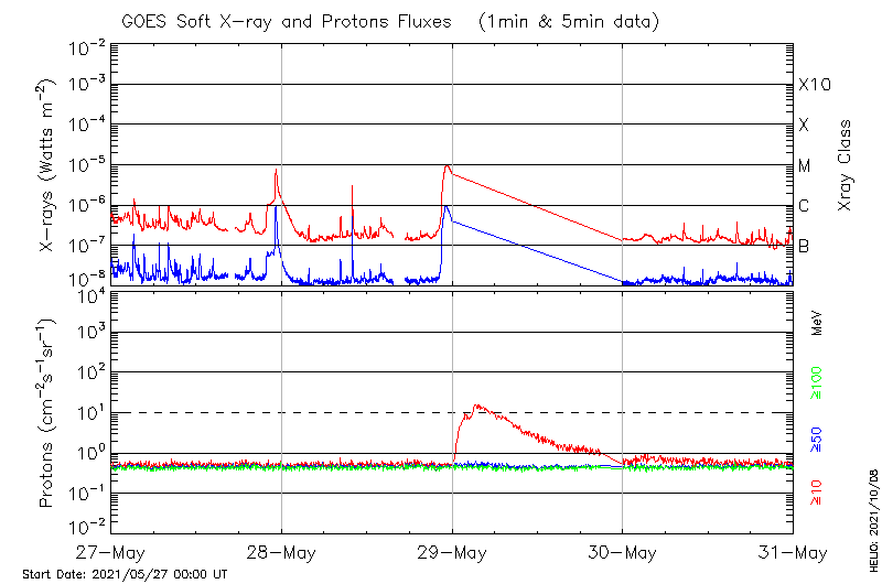 This page provides light-curves generated from GOES soft X-ray and Particle data for the date indicated at the top and the preceding three days.
