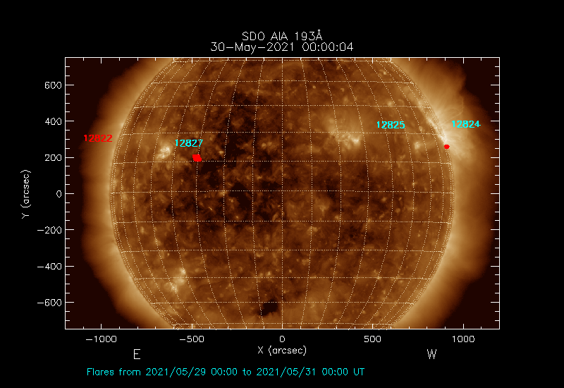 Click on an Active Region plot to display the Region Report including the region evolution and flaring history. HEC Search for NOAA Active Regions (SRS) records for this date and the day before.