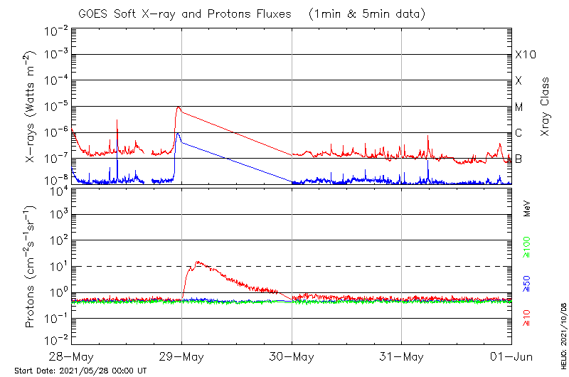 This page provides light-curves generated from GOES soft X-ray and Particle data for the date indicated at the top and the preceding three days.