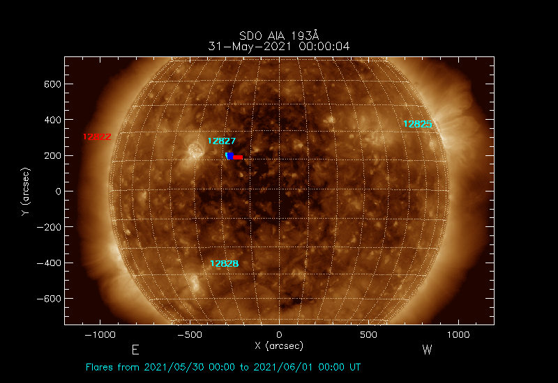 Click on an Active Region plot to display the Region Report including the region evolution and flaring history. HEC Search for NOAA Active Regions (SRS) records for this date and the day before.