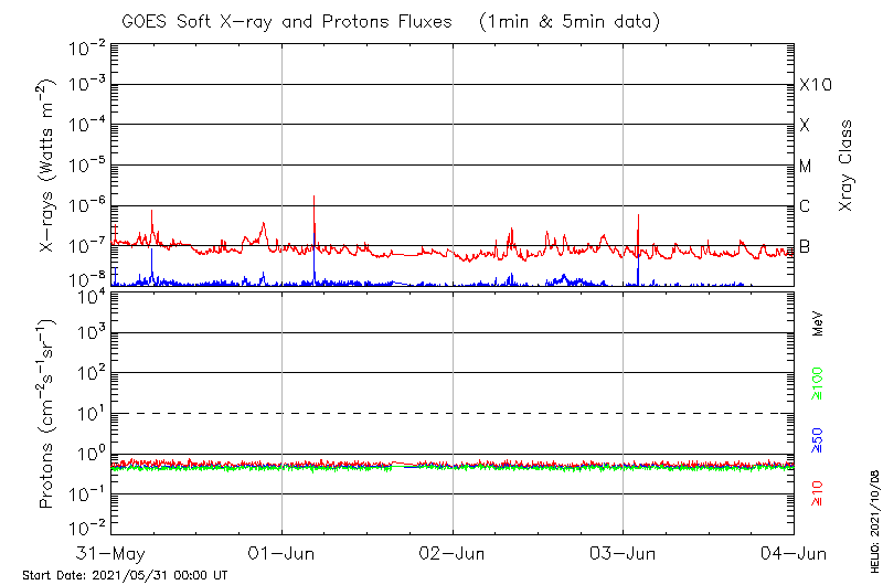 This page provides light-curves generated from GOES soft X-ray and Particle data for the date indicated at the top and the preceding three days.