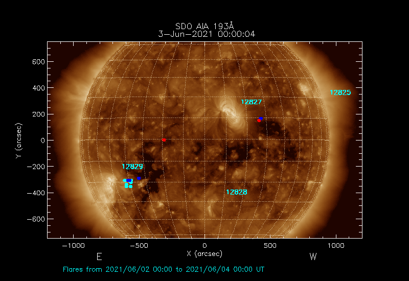The most recent flares (≤12 hours) are shown as red dots, 12-24 hours ago as blue dots and older ones as turquoise dots.