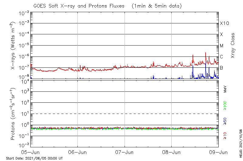 This page provides light-curves generated from GOES soft X-ray and Particle data for the date indicated at the top and the preceding three days.