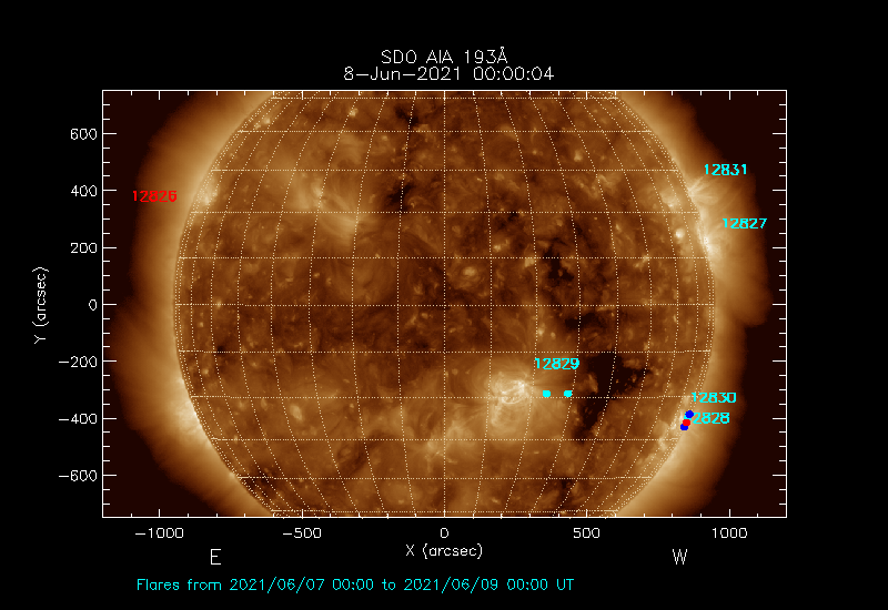 The most recent flares (≤12 hours) are shown as red dots, 12-24 hours ago as blue dots and older ones as turquoise dots.