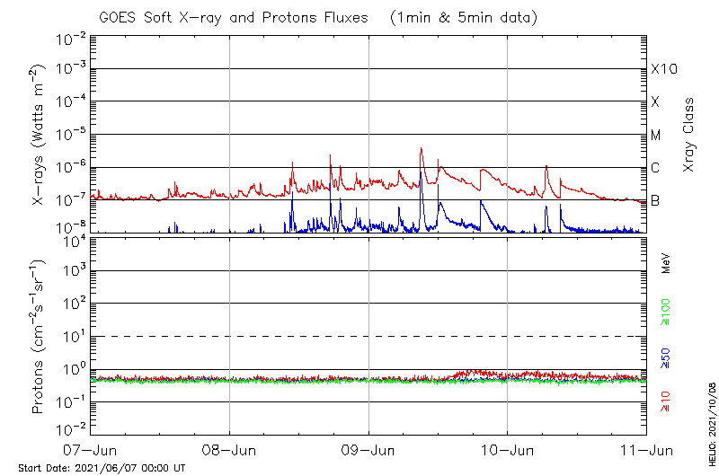 This page provides light-curves generated from GOES soft X-ray and Particle data for the date indicated at the top and the preceding three days.
