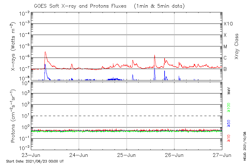 This page provides light-curves generated from GOES soft X-ray and Particle data for the date indicated at the top and the preceding three days.